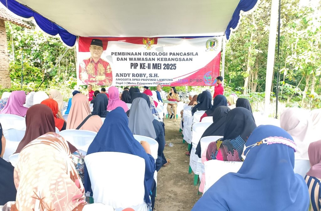 Politisi PDI Perjuangan, Andy Roby, menggelar sosialisasi Pembinaan Ideologi Pancasila (PIP) dan Wawasan Kebangsaan di Desa Sukabanjar, Kecamatan Gedong Tataan, Kabupaten Pesawaran, Sabtu, 25 Mei 2025,