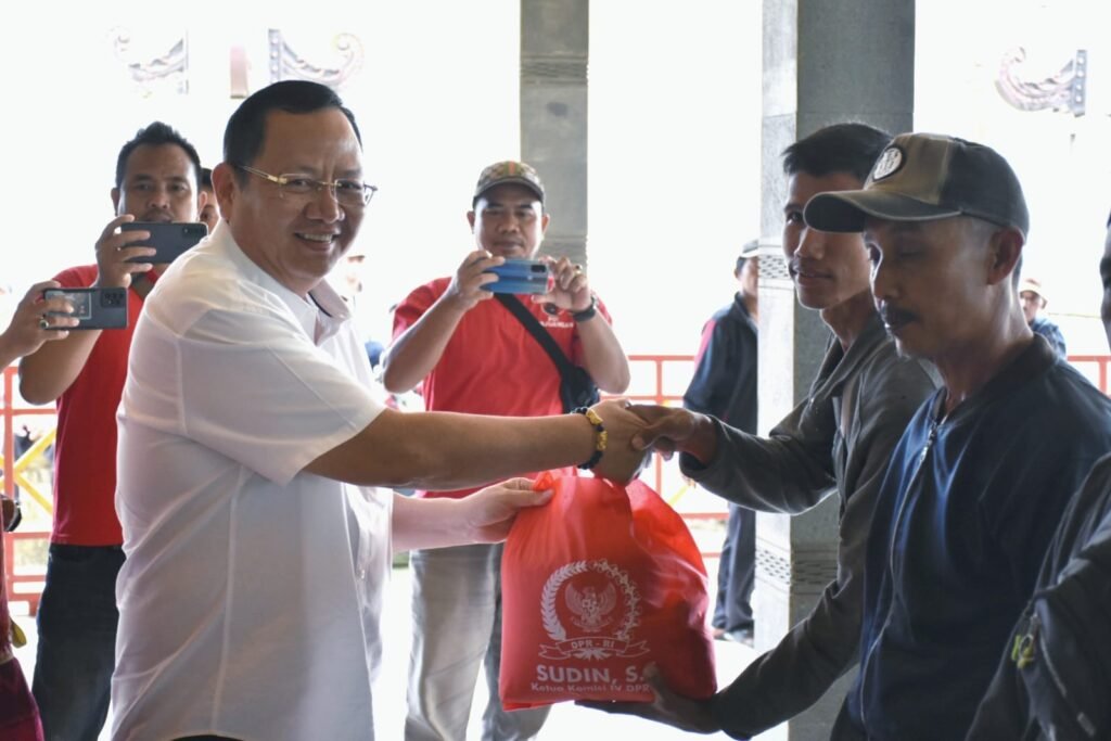 Tanggamus – Ketua Komisi IV DPR RI Sudin memberikan ratusan paket sembako dalam rangka pendampingan perlindungan dan pemberdayaan nelayan (bakti nelayan), di Kecamatan Kota Agung, Kabupaten Tanggamus, Sabtu (15/4/2023).