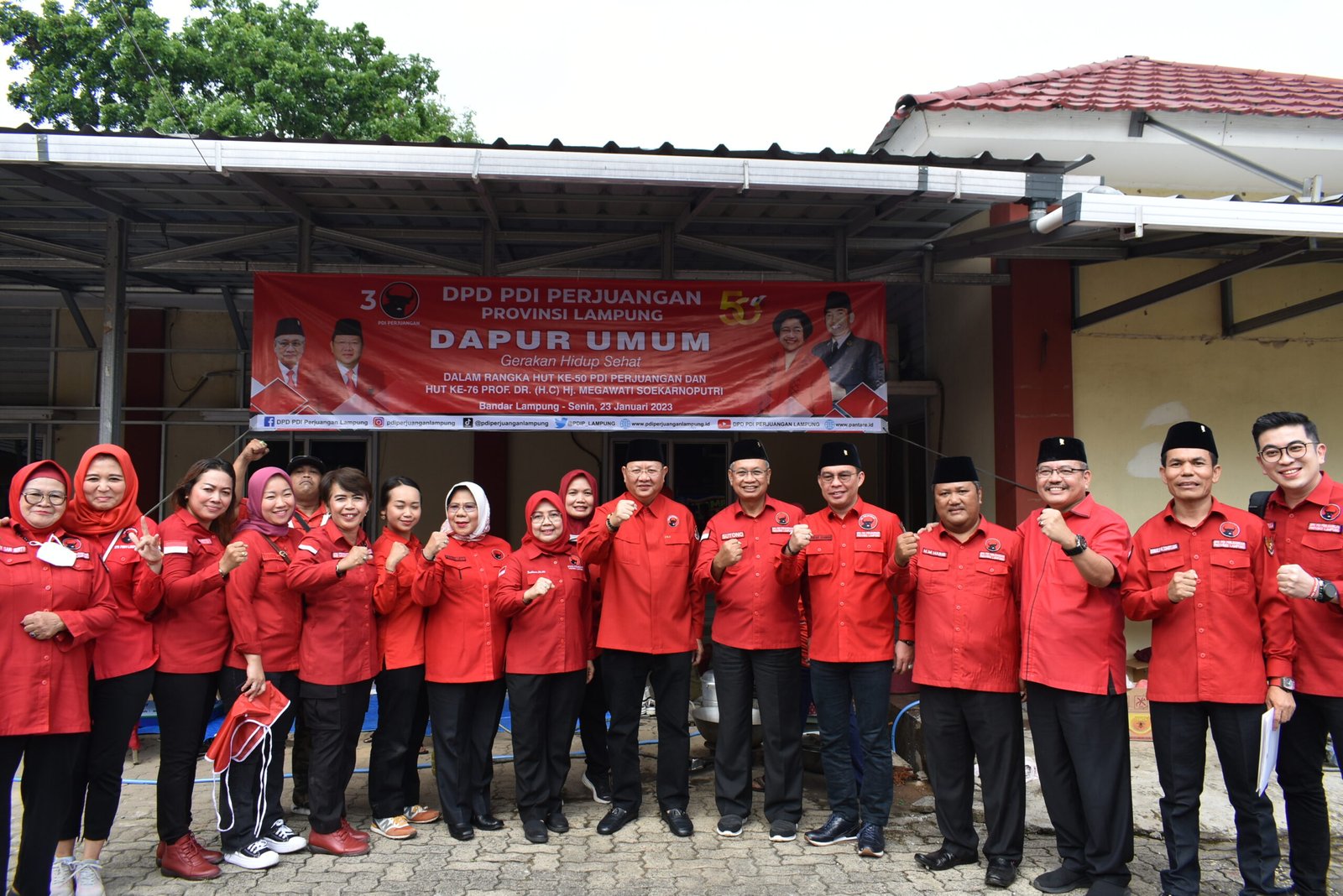 <p><br>HUT PDI Perjuangan ke 50 puncaknya telah dilaksanakan di JIExpo Kemayoran, Jakarta pada 10 Januari 2023 lalu. Dan dilanjutkan rangkaiannya pada hari ini dengan mendirikan dapur umum sekaligus memperingati HUT Ketua Umum PDI Perjuangan, Megawati Soekarniputri, di Kantor DPD PDI Perjuangan Lampung, Senin (23/1/2022).</p>