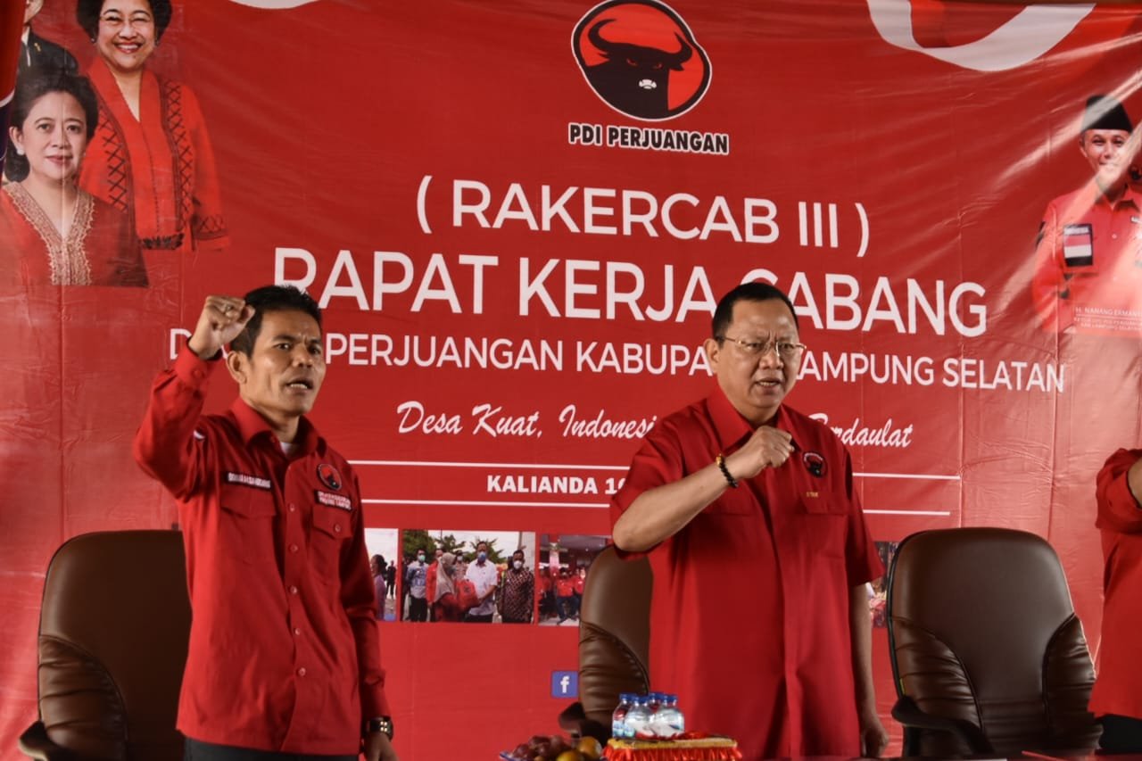 Lampung Selatan - Ketua Dewan Perwakilan Daerah Partai Demokrasi Indonesia (DPD PDI) Perjuangan Provinsi Lampung, Sudin membakar semangat para peserta Rapat…