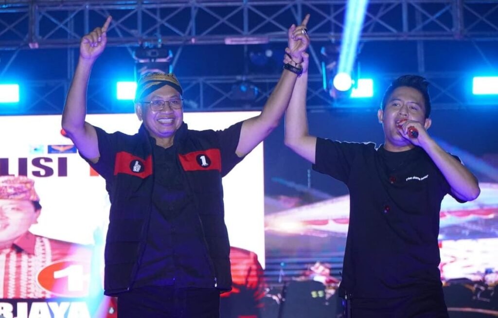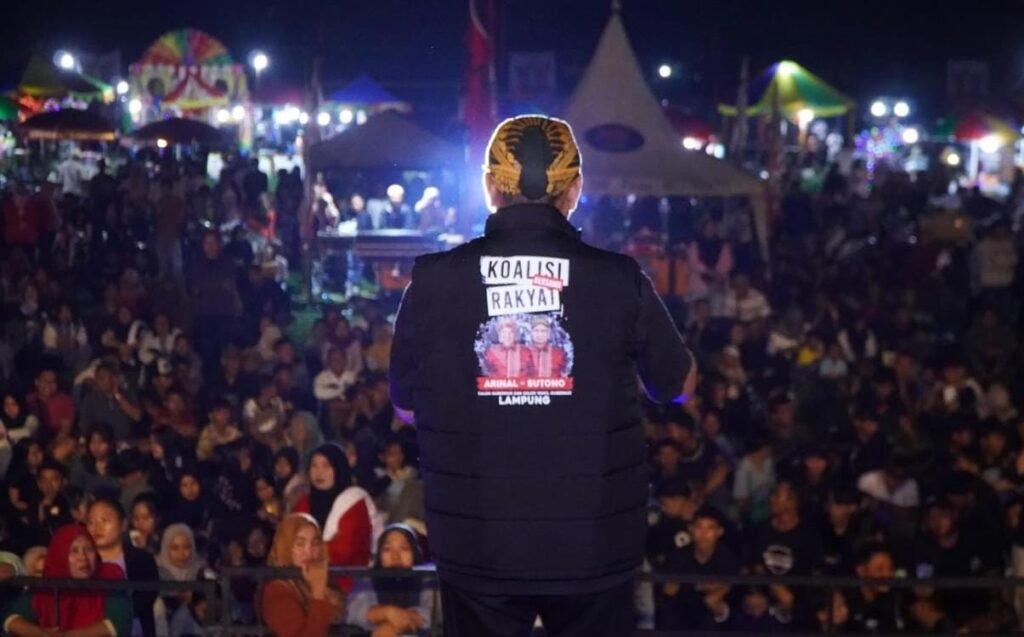 Metro – Ribuan masyarakat Kota Metro antusias menonton konser pesta rakyat Panah Ardjuno di Lapangan Rejomulyo, Metro, Jumat (22/11/202).