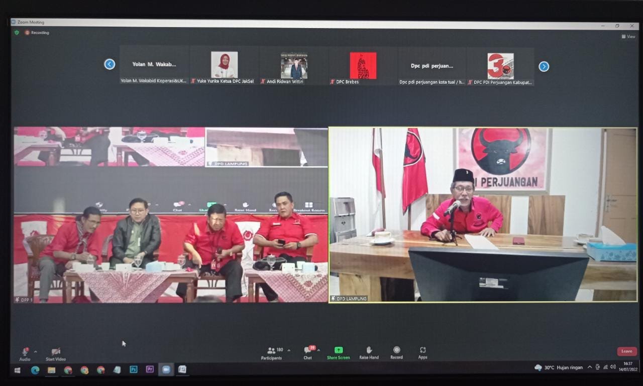 <p><br>Adapun Fungsionaris DPD PDI Perjuangan yang melakukan daring via zoom di Kantor DPD PDI setempat yaitu, Wakil Ketua Bidang Industri, Tenaga Kerja dan Jaminan Sosial, Cik Raden, Wakil Ketua Bidang Pangan, Pertanian, Kehutanan dan Lingkungan Hidup DPD PDI Perjuangan Lampung, Hermanus Suprapto, dan Wakil Ketua Bidang Ekonomi Kreatif dan Ekonomi Digital, Donald Harris Sihotang. <strong>(*)</strong></p>