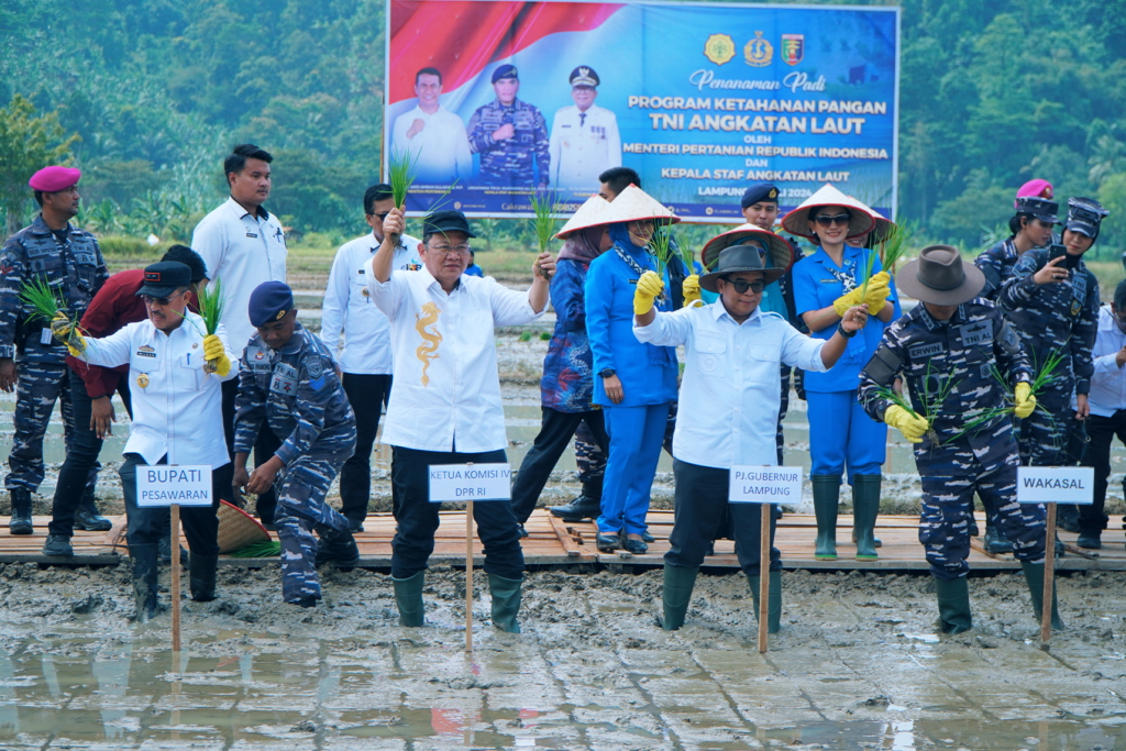 “TNI AL dapat menghasilkan padi, jagung, komoditas hortikultura, perkebunan dan perikanan yang bermanfaat bagi masyarakat dan persediaan pangan nasional. Mudah-mudahan dengan kehadiran Bapak Menteri Pertanian hari ini dan juga dukungan Gubernur Lampung dan Ketua Komisi IV DPR RI dapat upaya TNI AL dalam menghasilkan pangan dan penyediaan makan bergizi gratis ke depan,” tuturnya.