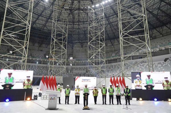 “Saya rasa itu yang saya sampaikan dengan mengucap bismilahirrahmanirrahim dan pada sore ini topping off Indoor Multifunction Stadium Gelora Bung Karno (GBK) saya nyatakan telah selesai,” kata Jokowi.