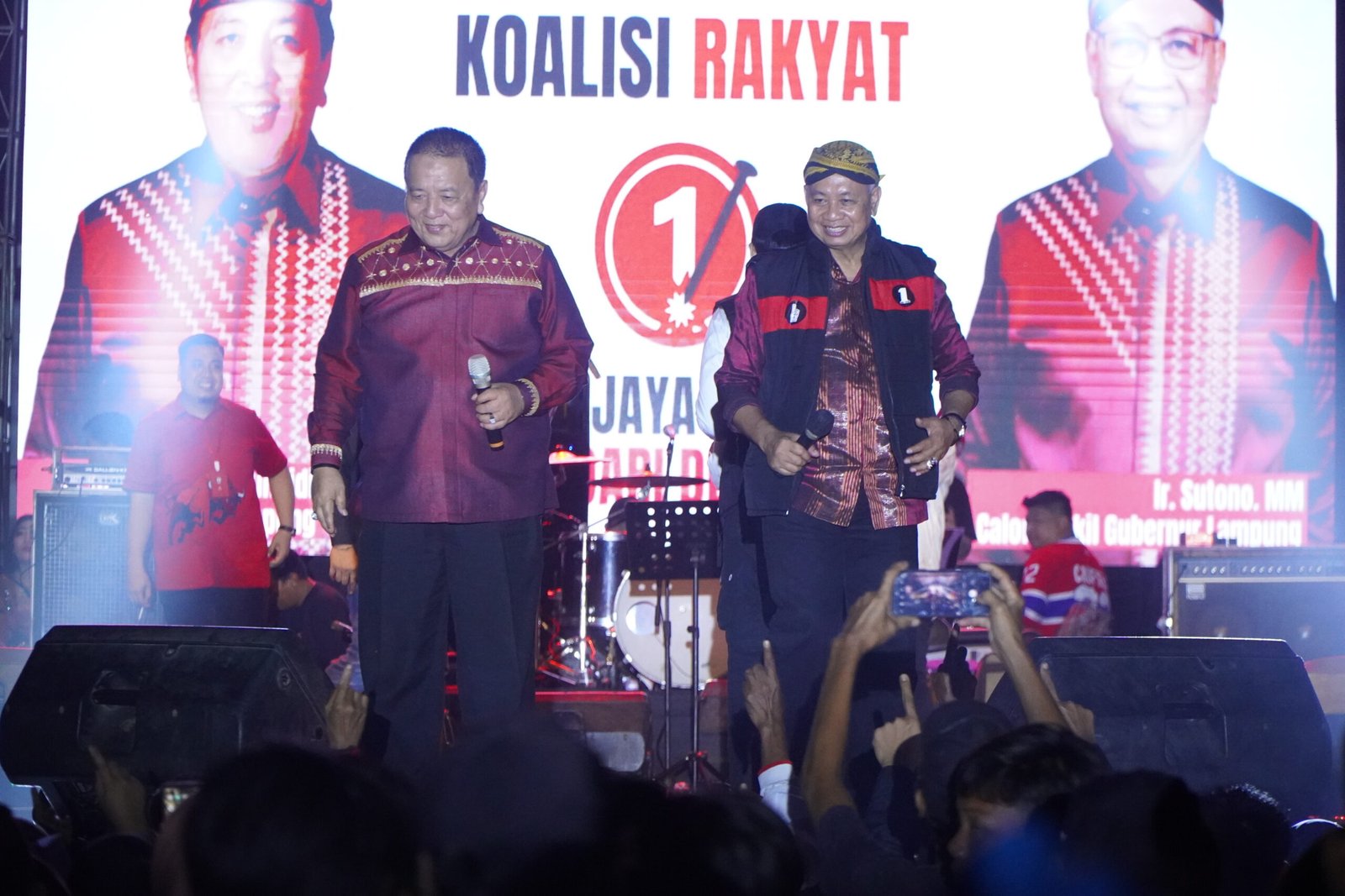 <p><br>Lampung Selatan &#8211; Deretan artis bintang tamu diantaranya Yusuf Cakculay, NTR Ambyar, dan Andika Kangen Band, kompak ajak masyarakat coblos pasangan calon (Paslon) Gubernur dan Wakil Gubernur Arınal Djunaidi &#8211; Sutono (Ardjuno)</p>