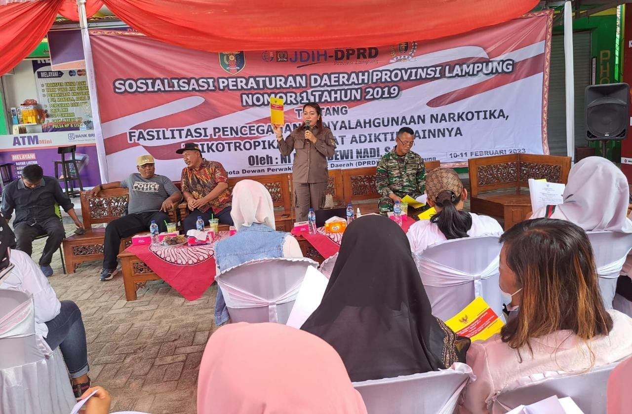 Lampung Tengah – Keprihatinan atas maraknya kasus narkoba yang terjadi di Provinsi Lampung, Anggota DPRD Provinsi Lampung Fraksi PDI Perjuangan, Ni Ketut Dewi Nadi, gelar Sosperda no 1 tahun 2019 tentang fasilitasi penyalah gunaan narkotika, psikotropika dan zat adiktif lainya. di Kampung Rukti Harjo, Seputih Raman, Lampung Tengah (10/2/2023)