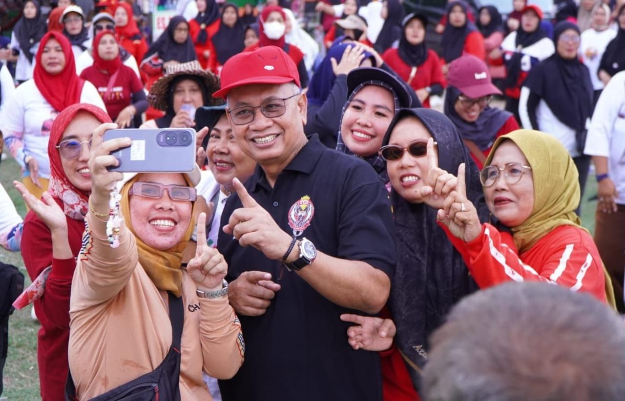 <p>Pantauan di lapangan, masyarakat sangat antusias mengikuti senam. Kemeriahan bertambah saat kedatangan Calon Wakil Gubernur Lampung, Sutono hingga banyak warga yang berswafoto.</p>
