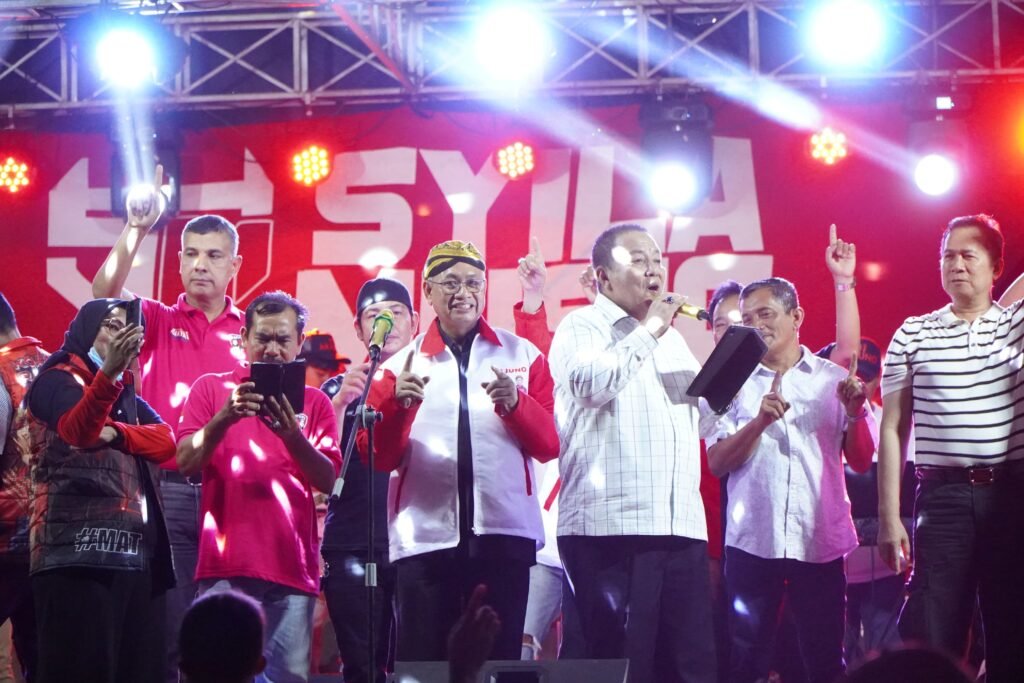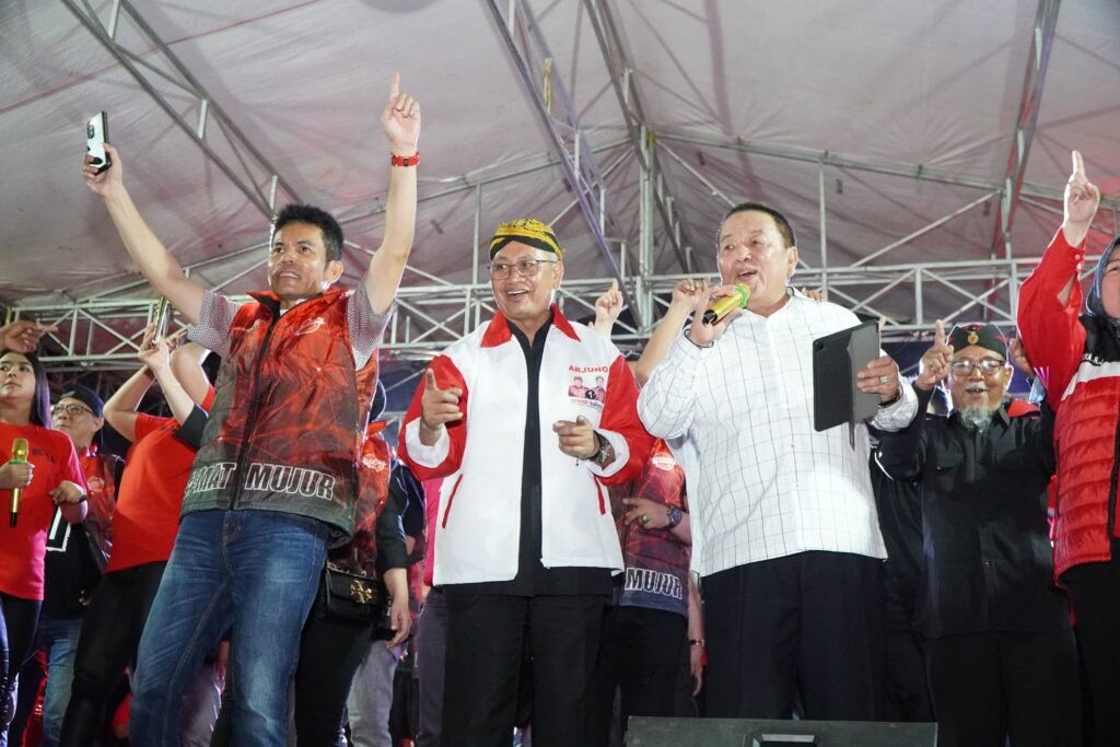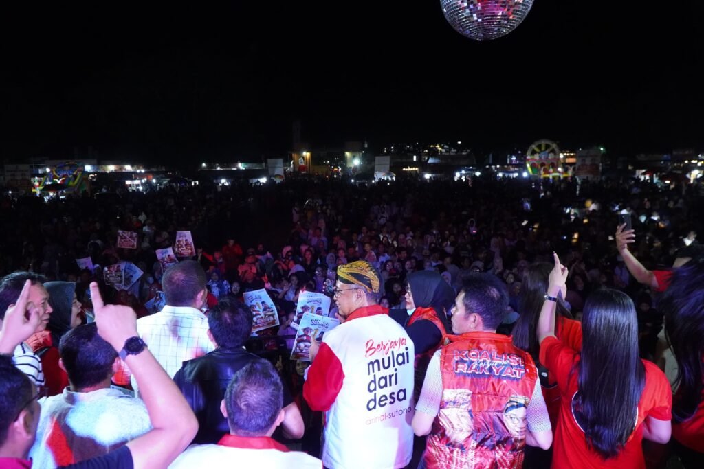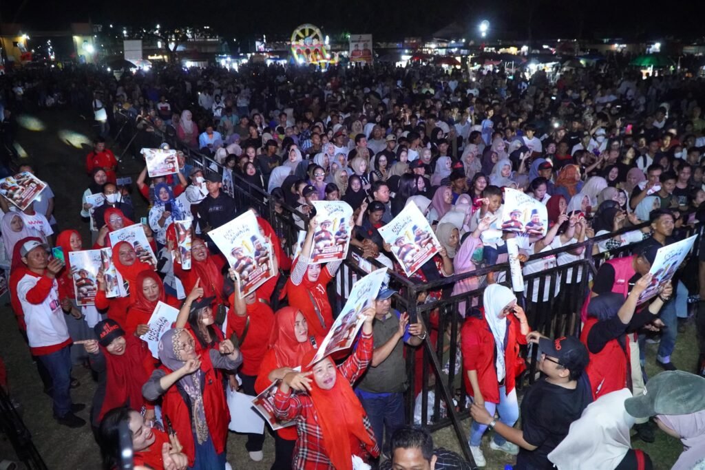 Lampung Timur – Ribuan warga Lampung Timur memadati Lapangan Sribawono untuk menghadiri pesta rakyat bersama pasangan calon gubernur dan wakil gubernur Lampung nomor urut 1, Arinal Djunaidi – Sutono, yang dikenal dengan sebutan Ardjuno, di Lapangan Sribhawono, kabupaten setempat, Senin, (28/10/2024) malam.