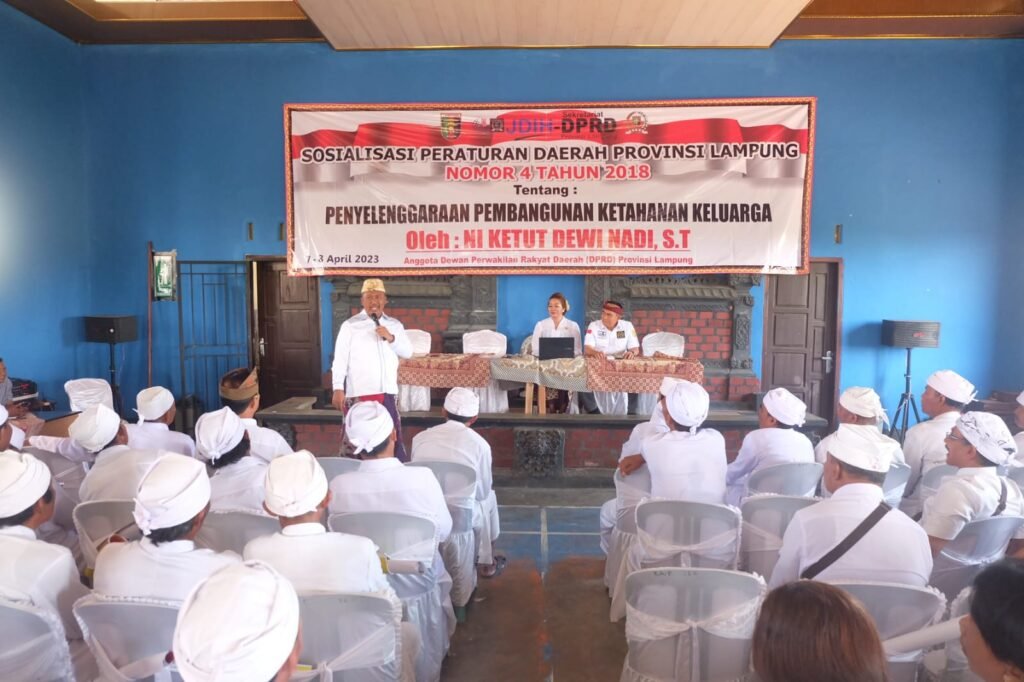 Lampung Tengah – Anggota DPRD Provinsi Lampung Fraksi PDI Perjuangan, Ni Ketut Dewi Nadi menggelar sosialisasi peraturan daerah (Perda) Nomor 4 Tahun 2018 tentang Penyelenggaraan Pembangunan Ketahanan Keluarga di Kampung Wirata Agung Kecamatan Seputih Mataram, Lampung Tengah, Sabtu (8/4/2023).