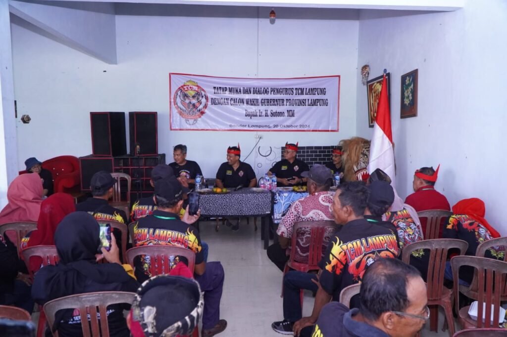 Bandar Lampung – Calon Wakil Gubernur Provinsi Lampung, Sutono melakukan tatap muka bersama paguyuban Turonggo Cipto manunggal (TCM) dalam rangka dialog dan konsolidasi menjelang Pilkada serentak 2024 mendatang, di Jalan Sam Ratulangi Gang Nangka, Gedong Air, Bandar Lampung, Minggu (20/10/2024).