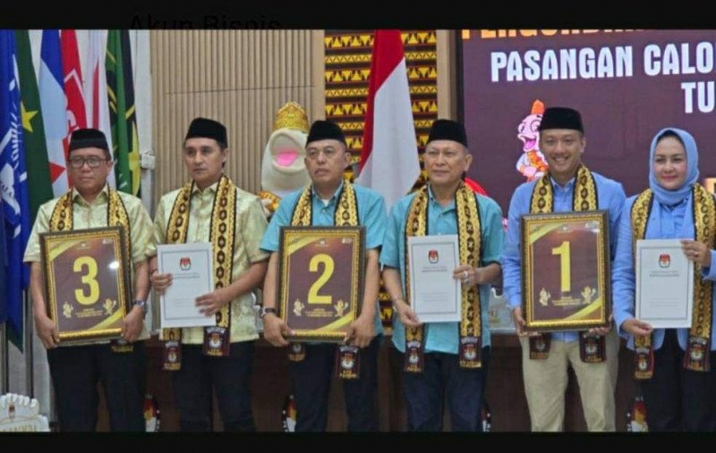 <p><br>Calon Bupati dan Wakil Bupati Winarti dan Reynata bersama dua pasangan calon Bupati dan Wakil Bupati Tulang Bawang yang telah ditetapkan, secara resmi menerima nomor urut pada pemilihan kepala daerah (Pilkada) Tulang Bawang pada 27 November 2024 mendatang, di Aula Kantor KPU Tulang Bawang, Senin (23/9/2024).</p>
