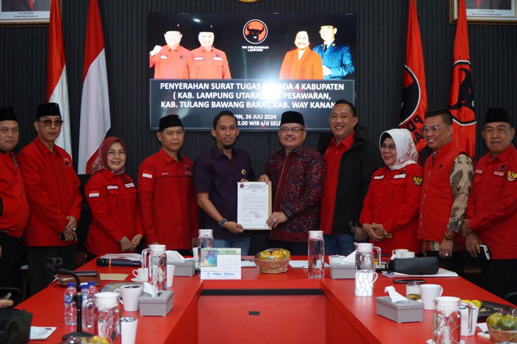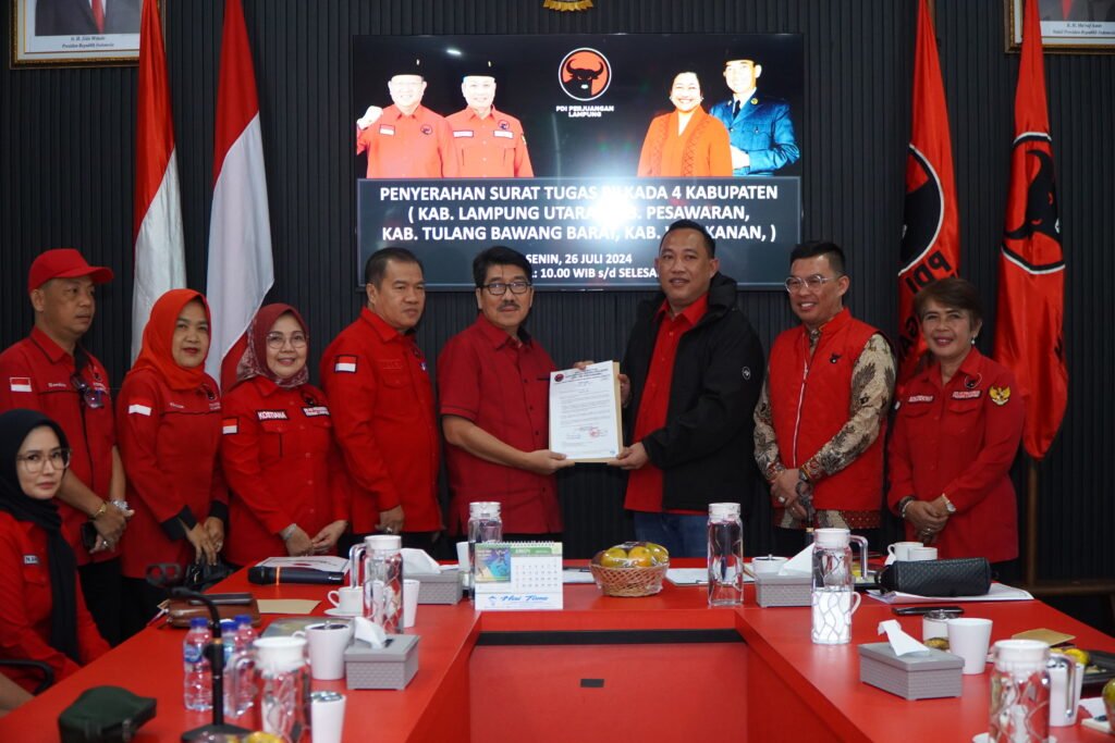 Penyerahan surat tugas itu, diberikan langsung oleh Ketua DPD PDI Perjuangan Lampung, Sudin, didampingi oleh fungsionaris Partai di kantor partai banteng yang berlokasi di Jalan P. Emir Nour, Teluk Betung Bandar Lampung, Jumat, (26/7/2024).