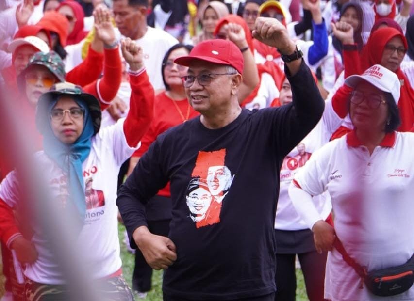 Metro – Calon Wakil Gubernur Lampung, Sutono disambut meriah oleh ratusan ibu-ibu senam, di Lapangan Rejomulyo, Kecamatan Metro Selatan, Kota Metro, Jumat (22/11/2024).