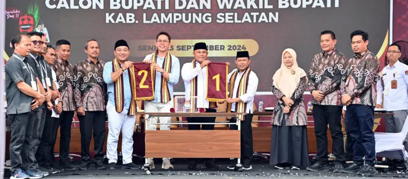 <p><br>Pasangan Calon Bupati dan Wakil Bupati Lampung Selatan, Nanang Ermanto dan Antoni Imam, resmi mendapatkan nomor urut satu dalam pemilihan kepala daerah (Pilkada) 2024, berdasarkan hasil pengundian yang dilakukan oleh KPU Lampung Selatan pada Senin, 23 September 2024. Sementara itu, pasangan Egi-Syaiful memperoleh nomor urut dua.</p>