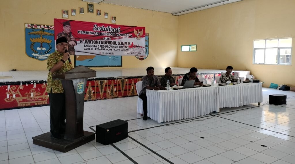 Metro – Anggota DPRD Provinsi Lampung Fraksi PDI Perjuangan, Watoni Noerdin menggelar sosialisasi pembinaan ideologi Pancasila di Aula Mulyojati Kota Metro, Minggu (18/6/2023).