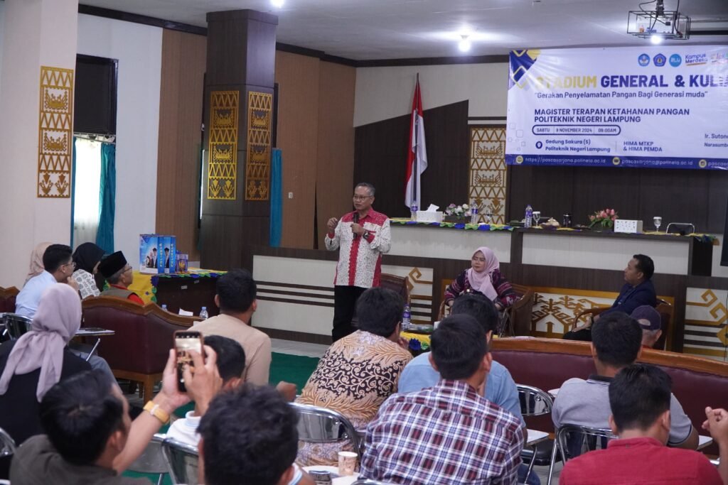 Bandar Lampung – Ketua DPW Perhiptani Provinsi Lampung, Sutono menghadiri, mengedukasi serta berdialog ihwal ketahanan pangan bersama mahasiswa, di Gedung Sakura Politeknik Negeri Lampung, Sabtu (9/11/2024).