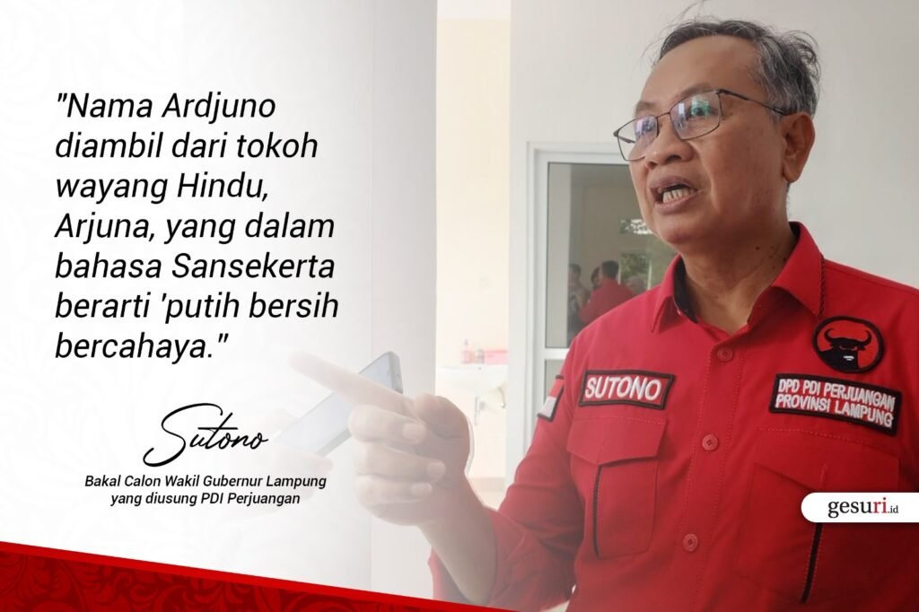 “Nama Ardjuno diambil dari tokoh wayang Hindu, Arjuna, yang dalam bahasa Sansekerta berarti ‘putih bersih bercahaya,” ujar Sutono di kantor DPD PDI Perjuangan Lampung, Jumat (6/9/2024).