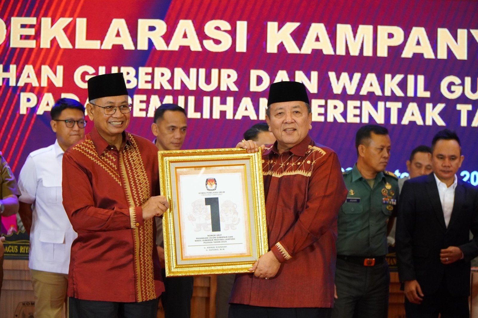 <p><br>Pasangan Bakal Calon Gubernur dan Wakil Gubernur Lampung, Arinal Djunaidi-Sutono mengusung tagline &#8220;Ardjuno&#8221; di Pilkada Lampung 2024. Bakal Calon Wakil Gubernur Sutono mengatakan, tagline ini merupakan akronim dari nama Arinal dan dirinya.</p>