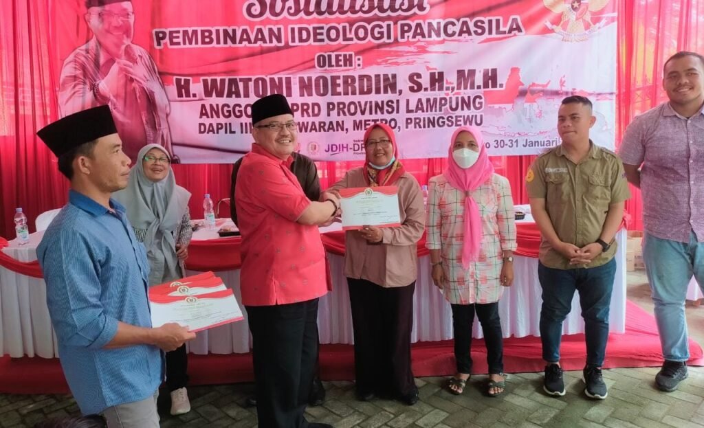 Metro – Anggota DPRD Provinsi Lampung, Watoni Noerdin mengapresiasi atas antusiasme keberagaman warga masyarakat yang hadir sebagai peserta pada kegiatan Sosialisasi Pembinaan Ideologi Pancasila (PIP) di kelurahan Iringmulyo, Metro Timur, Metro. Selasa (31/1/2023).